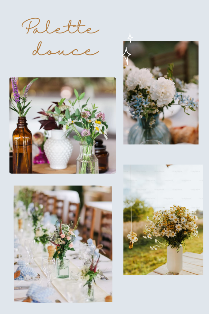 Un mini moodboard vous sera transmis après notre premier entretien pour vous aider à imaginer ma proposition. C’est un cahier qui vous donnera une idée de l’esprit, des couleurs et des inspirations qui seront employés pour le grand jour. Après signature du devis, je vous en confectionnerai un plus complet, grâce auquel vous pourrez visualiser clairement ce que je vais faire. Il permettra également d’apporter quelques réajustements si besoin.