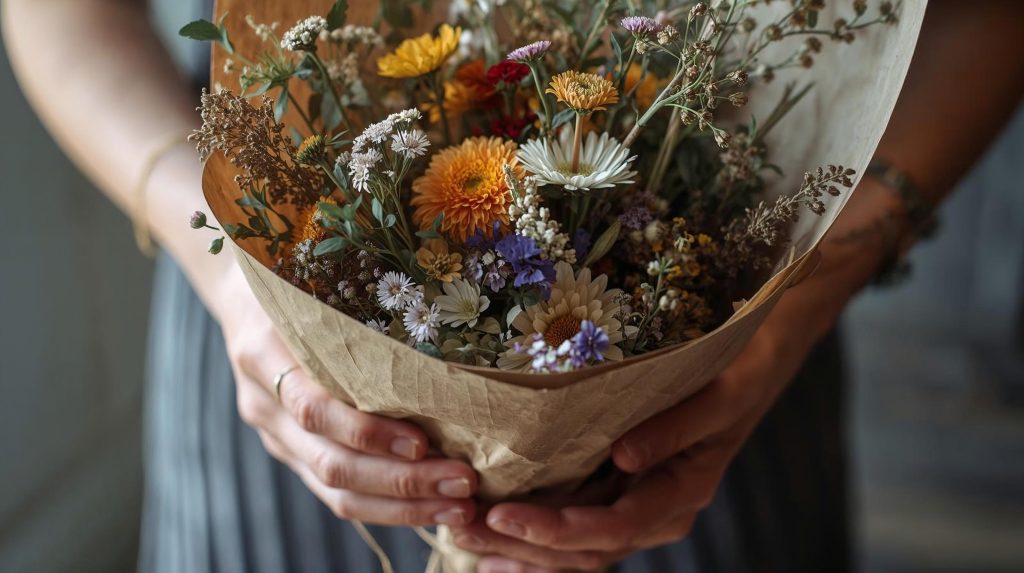 - une sélection d’objets de décoration à moindre impact écologique: des vases chinés, des cadres floraux ou des couronnes de fleurs séchées naturelles 100% locales.