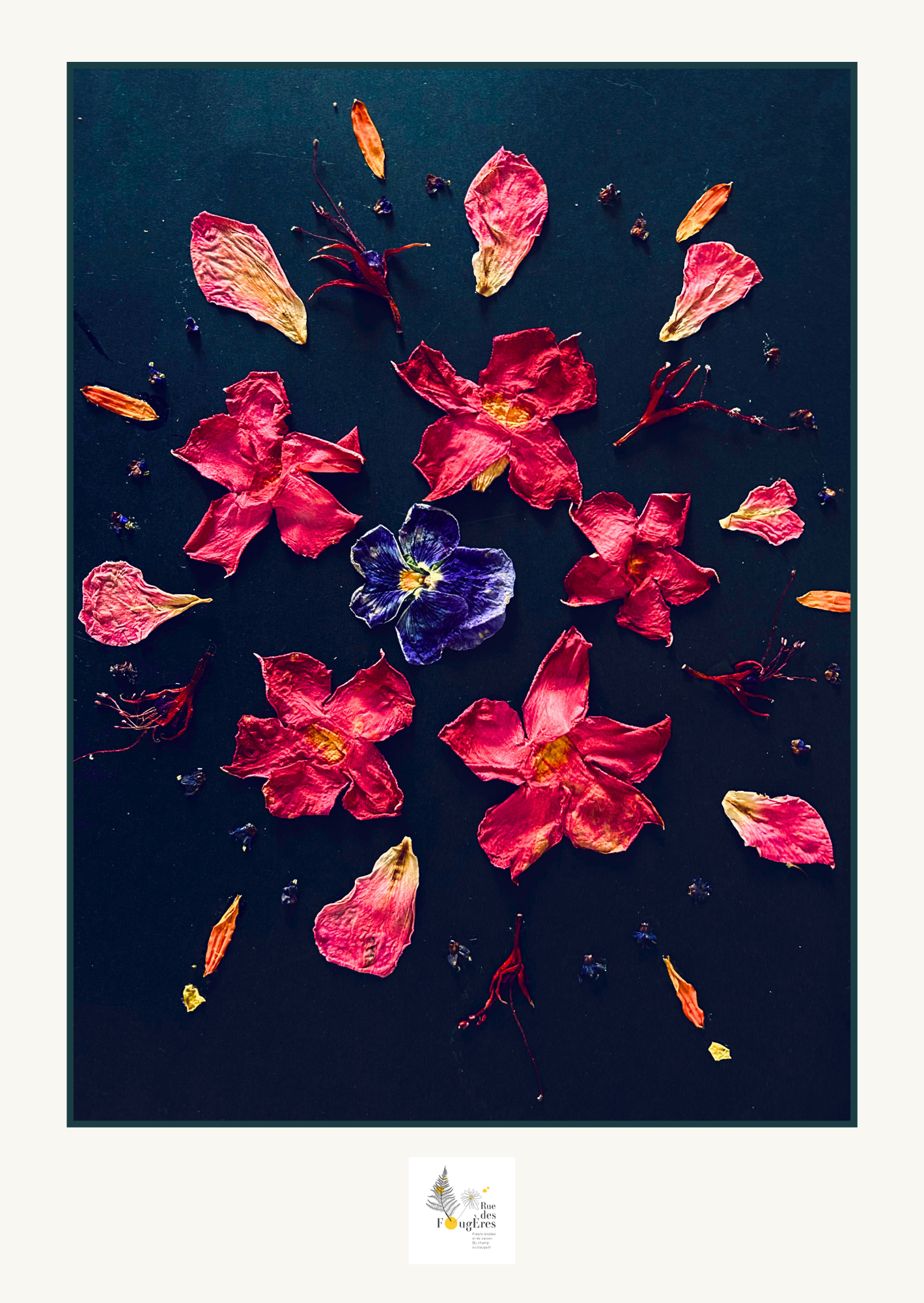 Dans ma démarche zéro déchet, je travaille la matière qui reste après la composition florale (pétales, fleurs à tiges courtes, fleurs tombées, feuilles ou branches tordues, trouées…). A partir de cela, je compose des arrangements éphémères que je prends en photo pour créer des cartes et des affiches. Une jolie idée pour accompagner un bouquet à offrir !