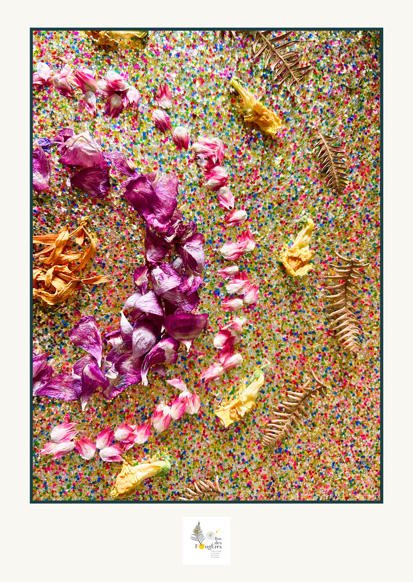 Dans ma démarche zéro déchet, je travaille la matière qui reste après la composition florale (pétales, fleurs à tiges courtes, fleurs tombées, feuilles ou branches tordues, trouées…). A partir de cela, je compose des arrangements éphémères que je prends en photo pour créer des cartes et des affiches. Une jolie idée pour accompagner un bouquet à offrir !