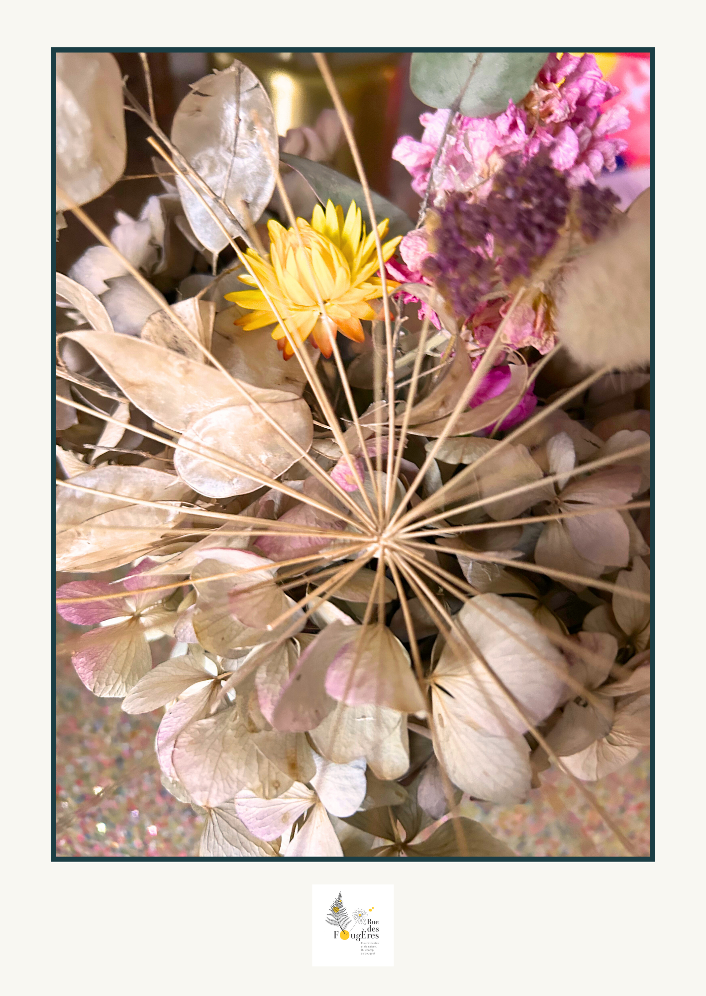 Dans ma démarche zéro déchet, je travaille la matière qui reste après la composition florale (pétales, fleurs à tiges courtes, fleurs tombées, feuilles ou branches tordues, trouées…). A partir de cela, je compose des arrangements éphémères que je prends en photo pour créer des cartes et des affiches. Une jolie idée pour accompagner un bouquet à offrir !